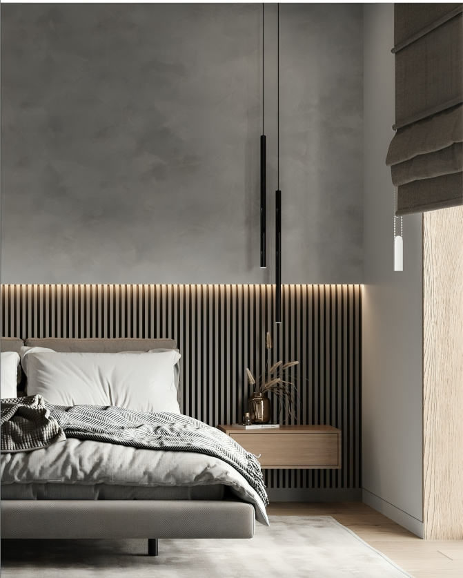 This bedroom strikes a perfect balance between modern simplicity and serene sophistication. The interplay of textures, the gentle contrast between cool grays and warm wood, and the elegant lighting create a space that’s both restful and design-forward. It feels like a refined urban retreat—minimal, cozy, and completely composed.