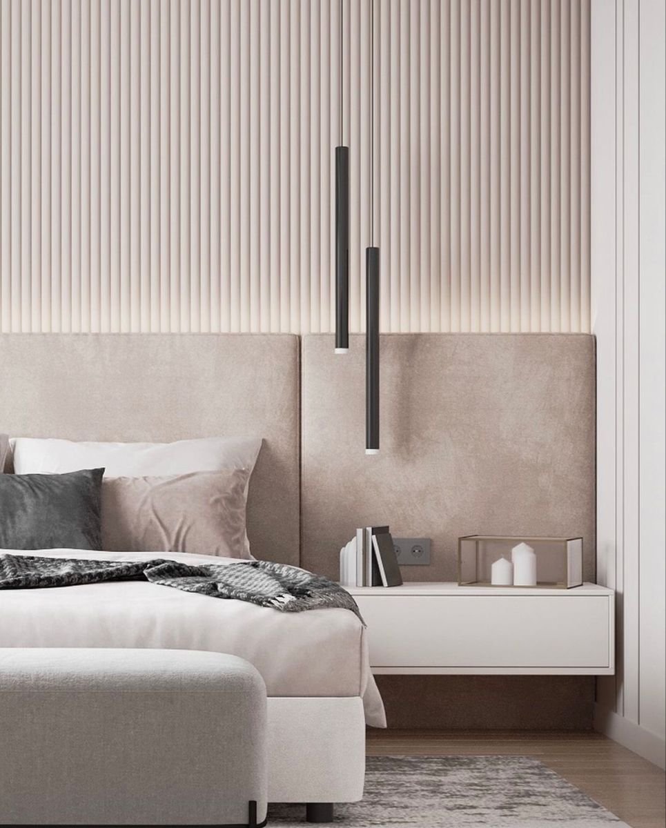 In a nutshell, this bedroom is a tranquil retreat with a modern edge. The vertical wood slat wall enriches the space with visual rhythm, while the muted neutrals and floating furniture echo minimalist elegance. The pendant lights add a sculptural touch and enhance the carefully curated calm.